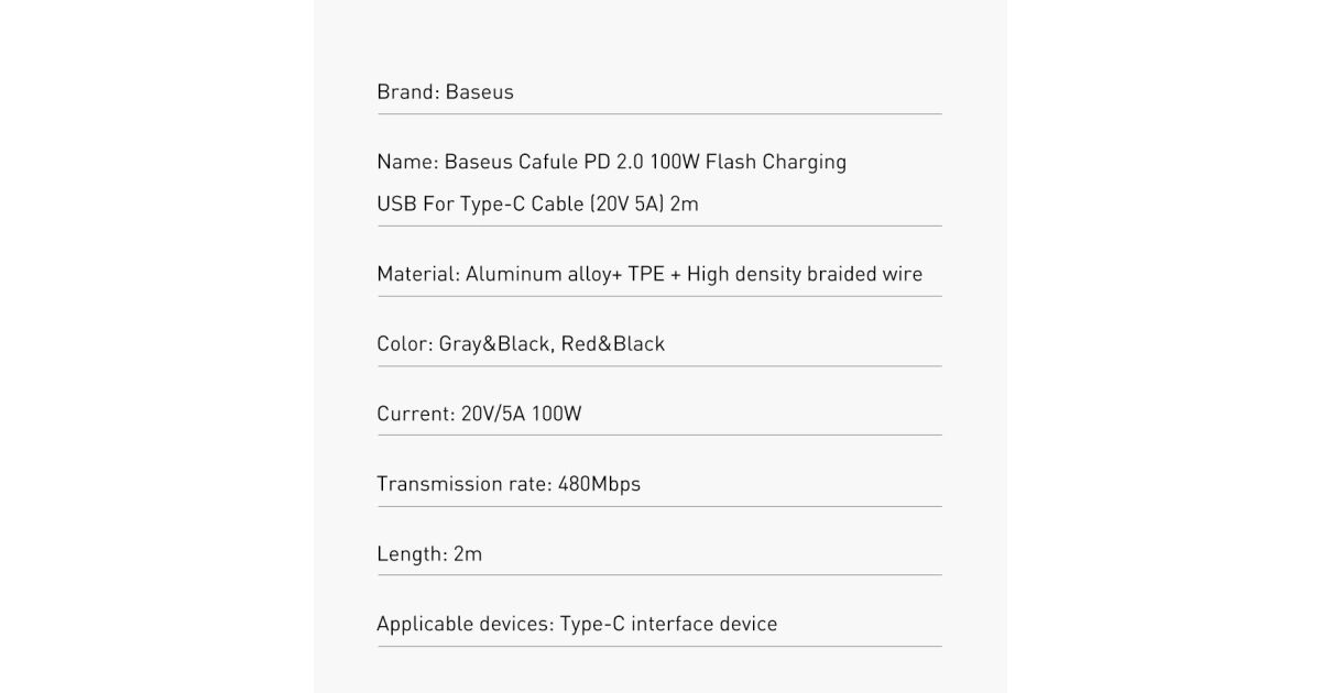 Baseus Cafule USB-C – USB-C kábel, QC 3.0, PD 2.0, 100 W, 5A, 2 m (piros-fekete) leírása