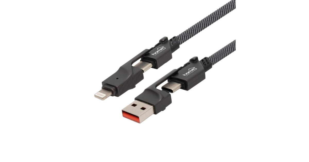 Home USB4X1 töltőkábel, 4in1, USB C-C / A-C / C-LIGHTNING / A-LIGTNING, 1.1 méter, 66W gyorstöltés, szőtt nylon burkolat, lapos, gabalyodásmentes kábel leírása