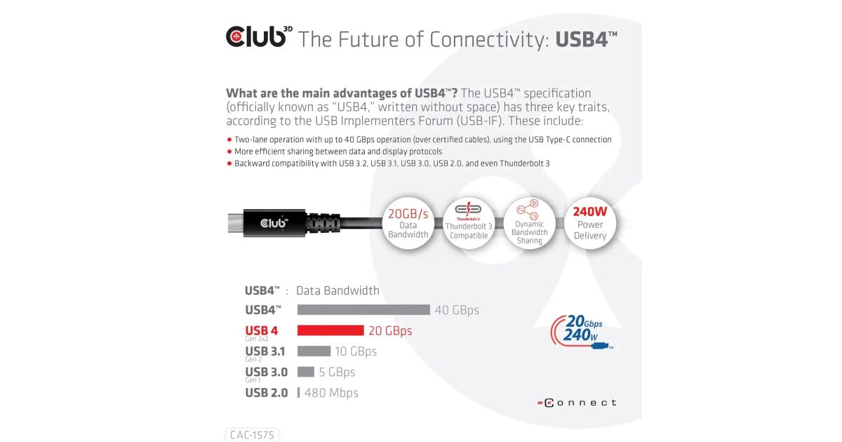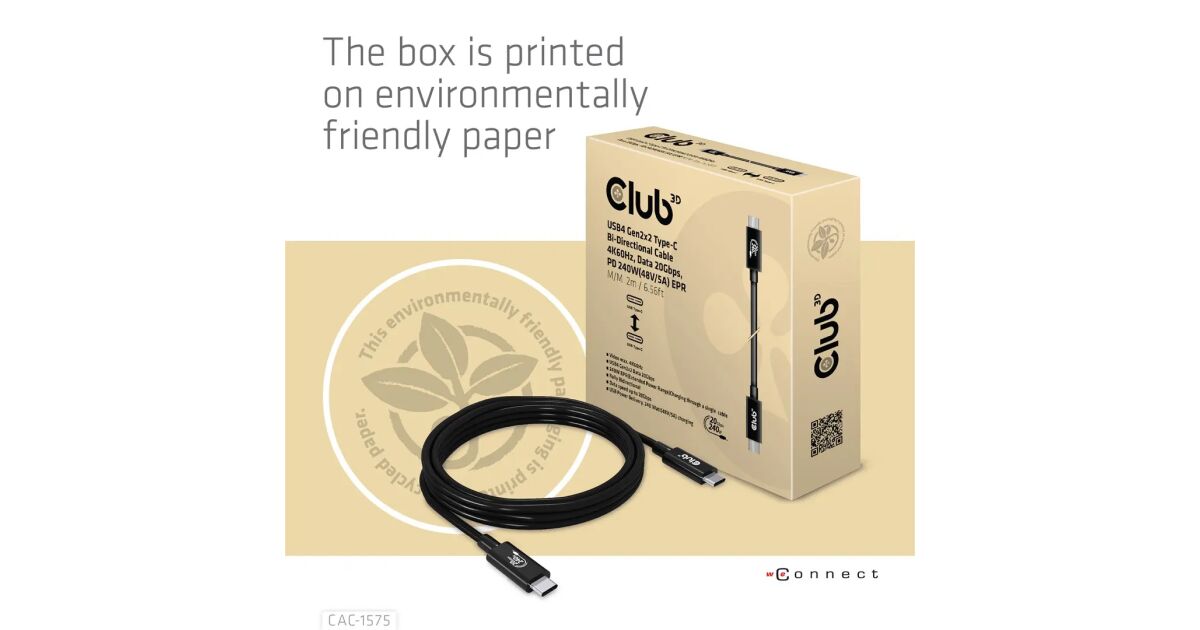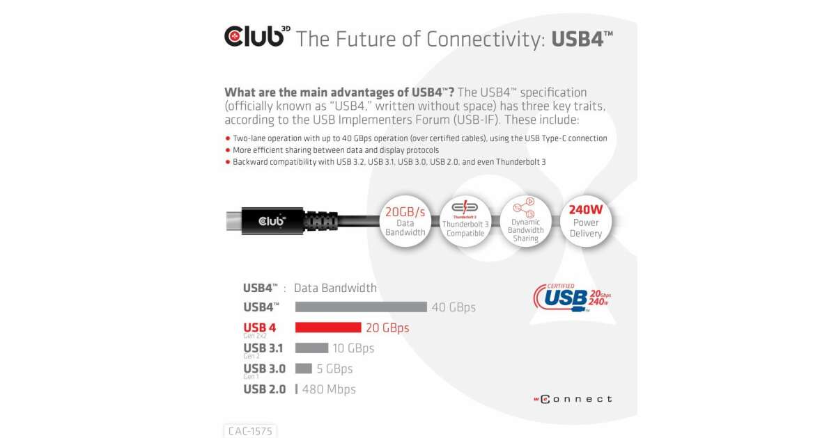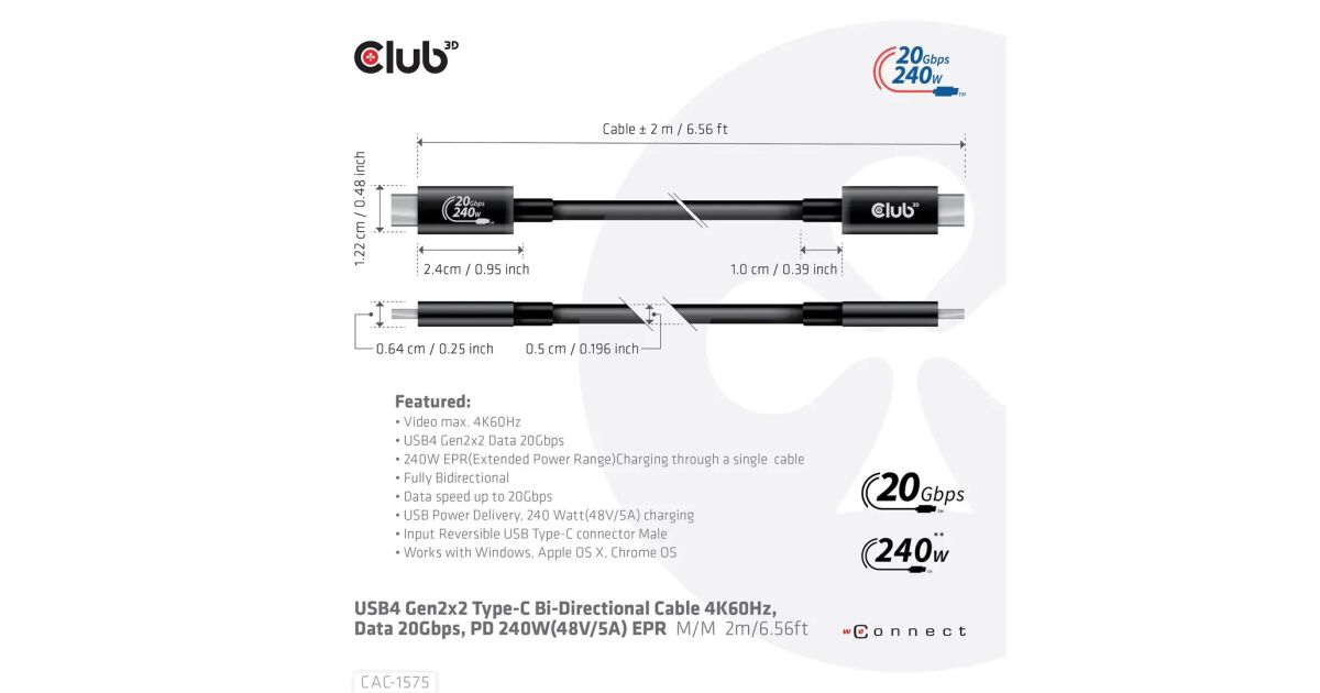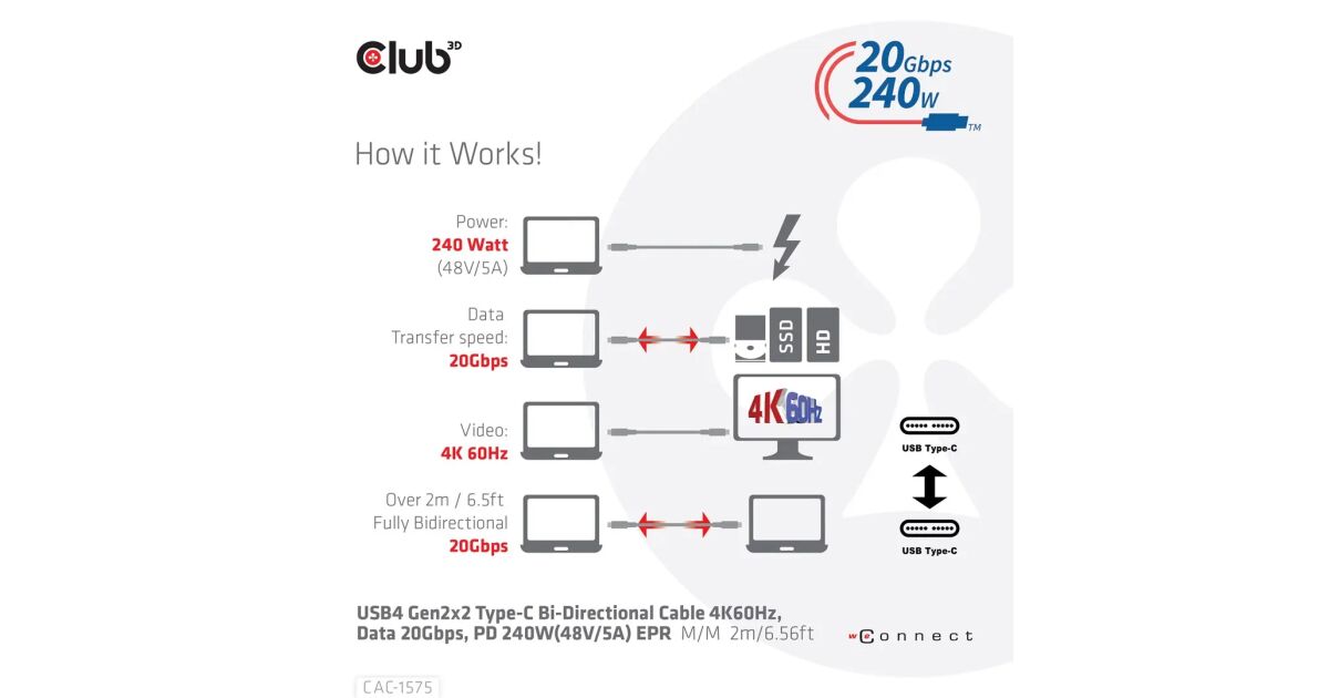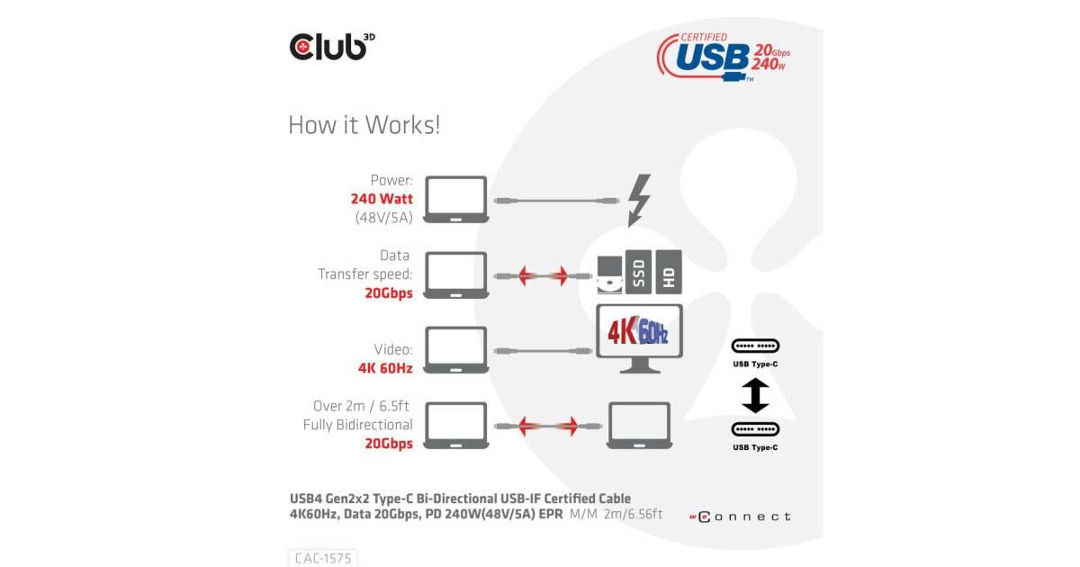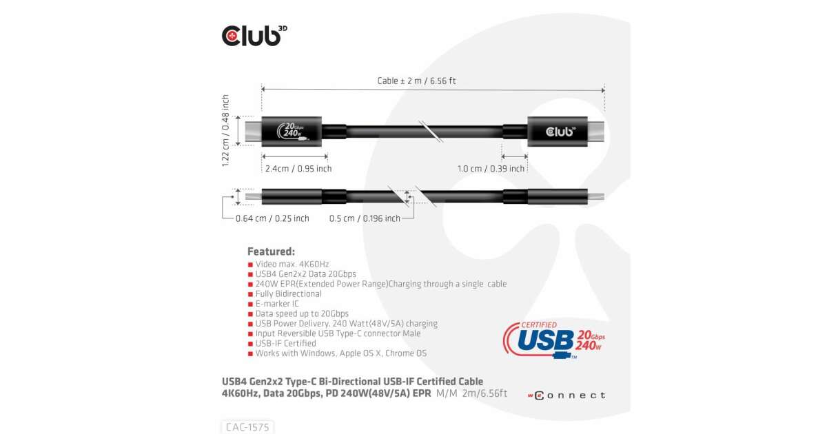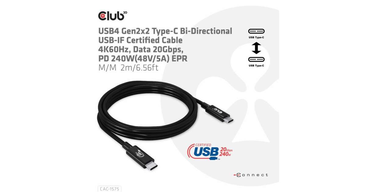 Club3D USB4 Gen2x2 Type-C Bi-Directional USB-IF Certified Cable 4K60Hz, Data 20Gbps, PD 240W(48V/5A) EPR M/M leírása