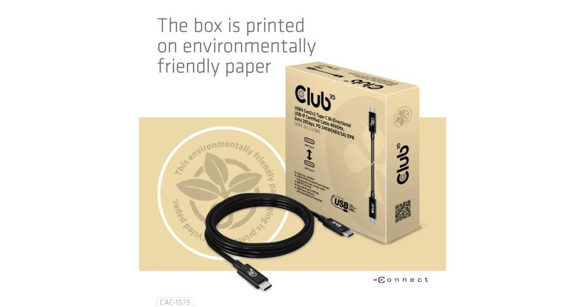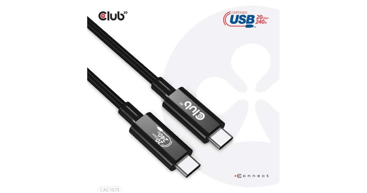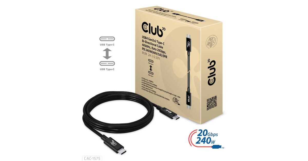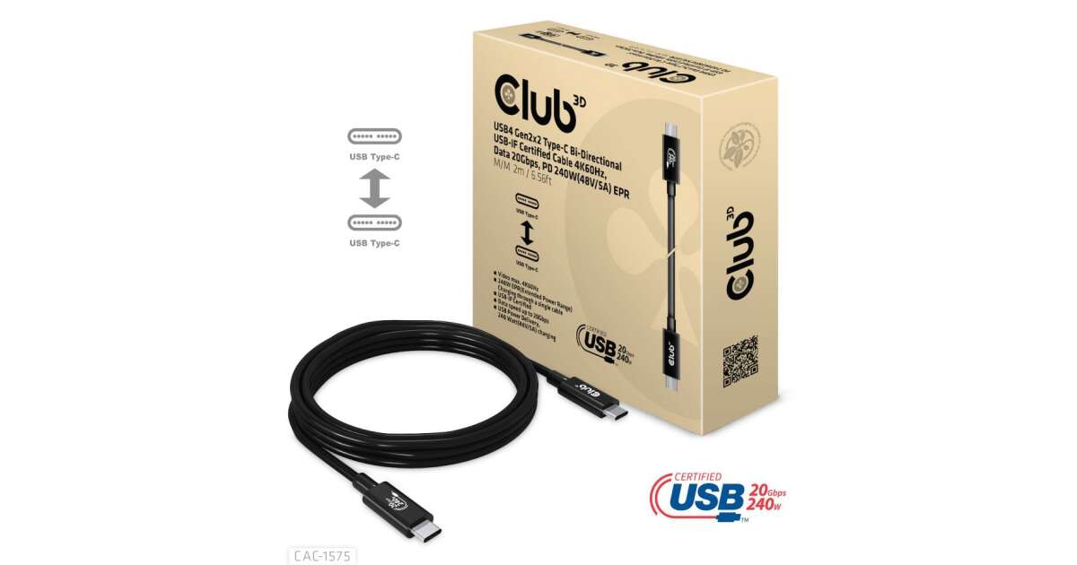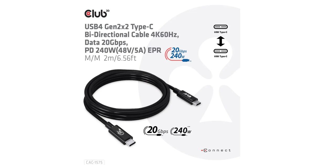 Club3D USB4 Gen2x2 Type-C Bi-Directional USB-IF Certified Cable 4K60Hz, Data 20Gbps, PD 240W(48V/5A) EPR M/M