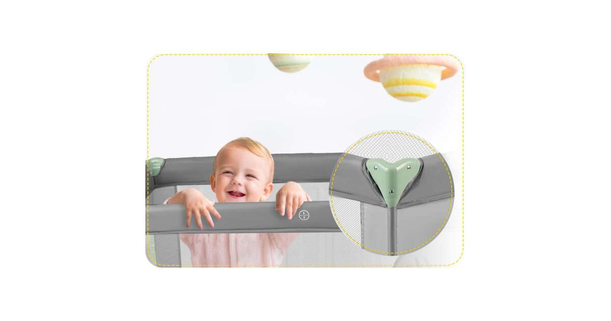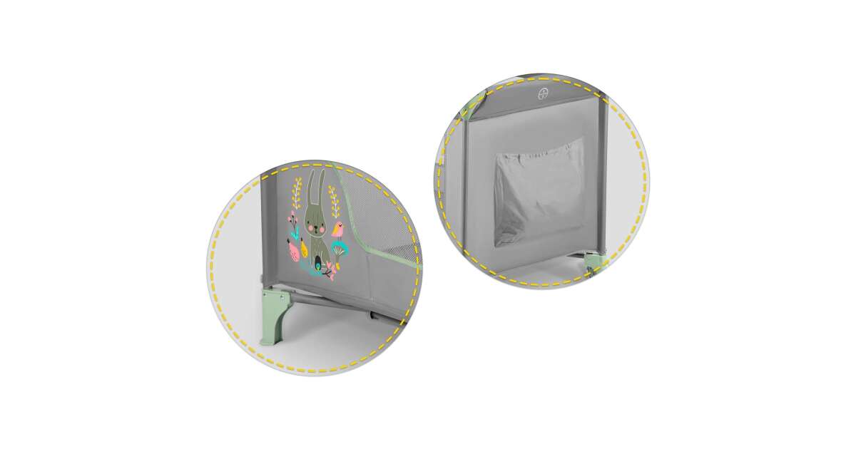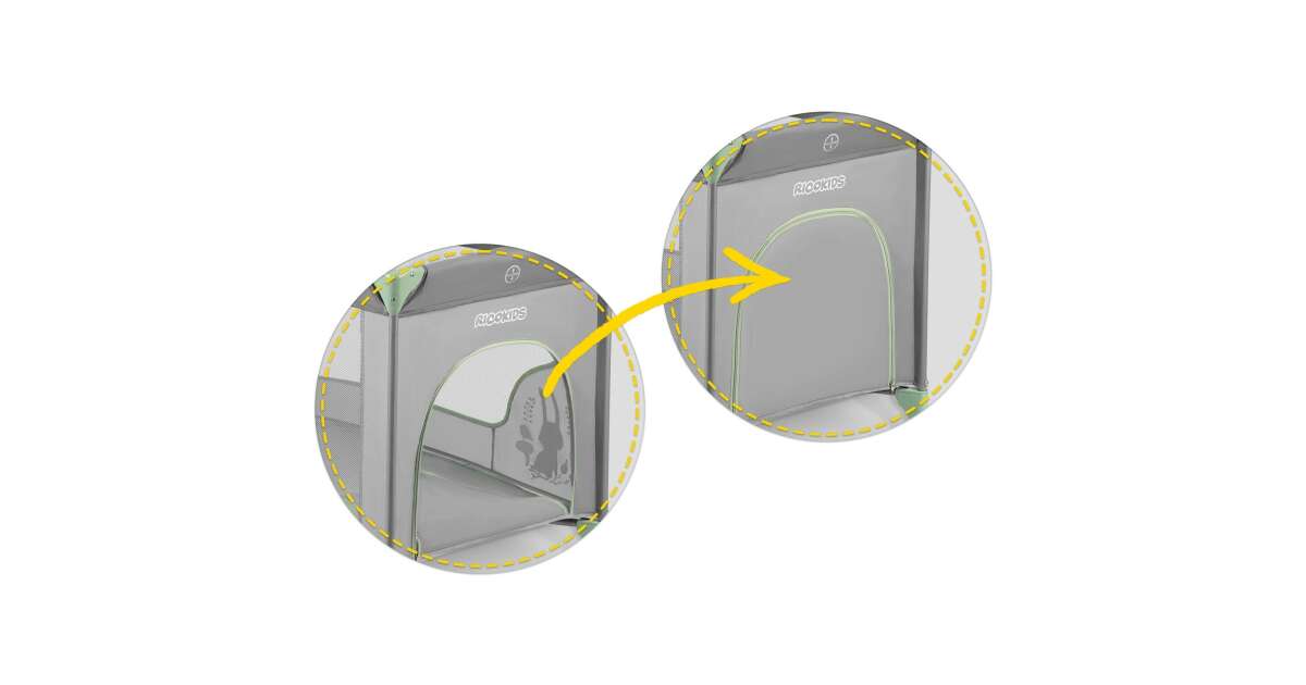 - Cipzárral zárható oldalsó bejárat: Megakadályozza, hogy a gyermek véletlenül kiszabaduljon. A szülők könnyen hozzáférhetnek a gyermekhez.