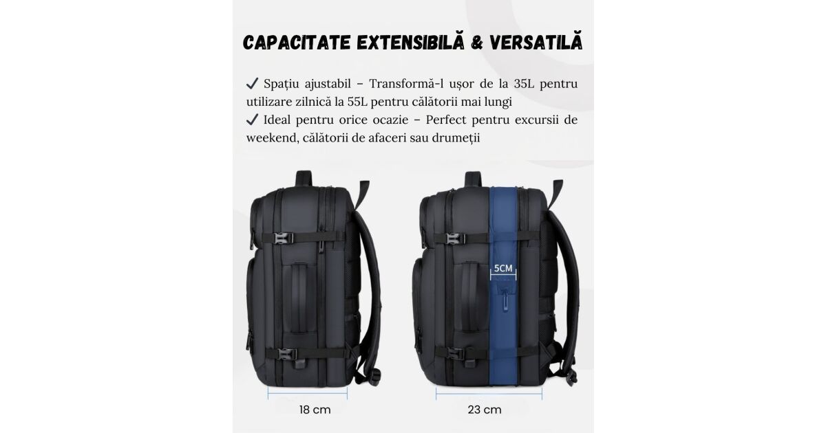 Versatyx® többfunkciós hátizsák, Űrtartalom 35-55L, Bővíthető, Ideális utazáshoz, Külön laptop zseb, Oldalsó fogantyú és kocsitartó, Vízálló, Több zseb, Cipzáros záródás, Megerősített, állíth