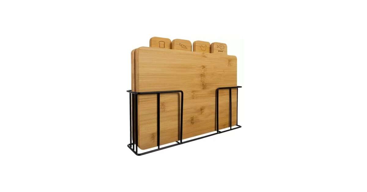 Készítsd elő a hozzávalókat könnyedén ezzel a 4 darabos bambusz vágódeszka szettel! A különböző piktogramokkal ellátott deszkák segítenek a higiénikus elkészítésben, a praktikus állvány pedig helytakarékos tárolást biztosít.