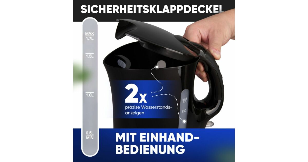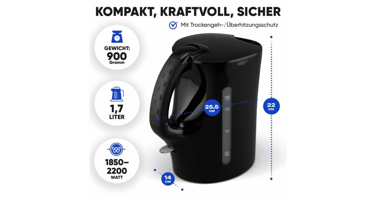 Bomann elektromos vízforraló, WK6079N, 1,7 literes űrtartalom, vízszintjelző, mosható vízkő szűrő, kompakt, fényjelző, csúszásmentes talp, ergonomikus fogantyú, 2200 W, fekete vásárlás: