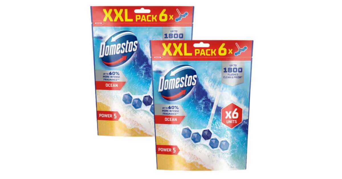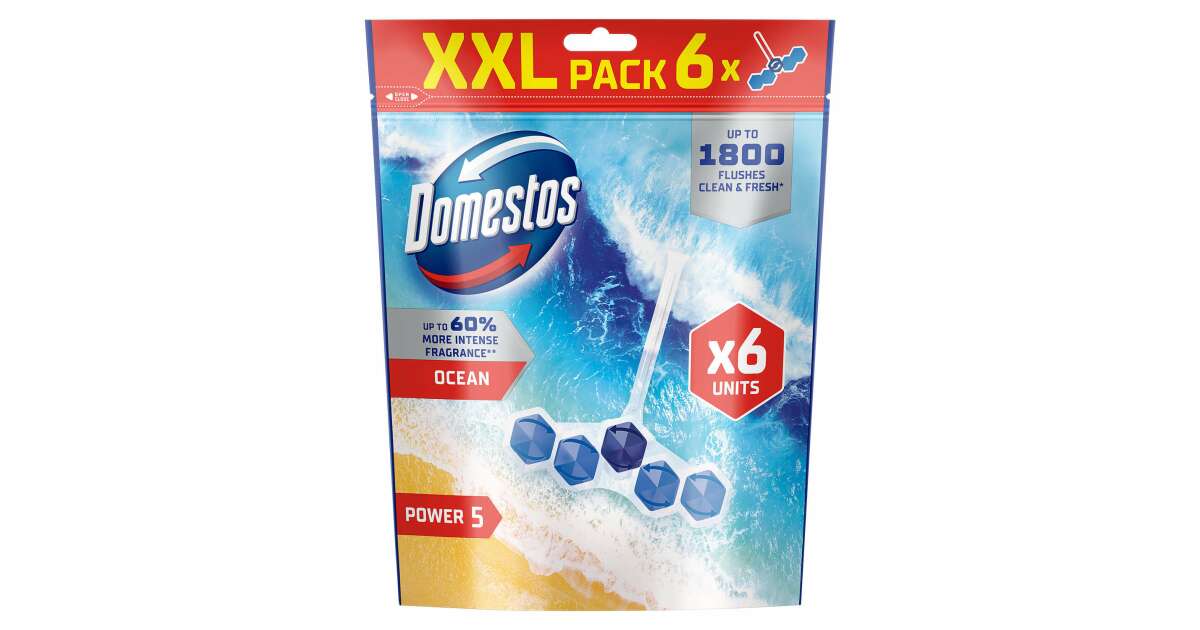 A Domestos Power5 WC frissítő blokkja segít megelőzni a koszt és a vízkőlerakódásokat a takarítások között is. Minden egyes öblítés után bőséges habot hagy maga után, amely segít megakadályozni a vízkőlerakódást, eltűntetni a koszt, és ragyogóvá tenni a WC kagylót, amely hosszan tartó kellemes illatot áraszt magából. Lakása tisztaságáért használja még a Domestos Higiéniai Törlőkendőt, a Domestos Extended Power fertőtlenítő hatású folyékony tisztítószerek egyikét és a Domestos Fertőtlenítő Spray-t. A Domestos Power5 Ocean WC-blokkok segítenek a szennyeződések eltávolításában, a vízkő elleni küzdelemben, és mindennapos frissességet biztosítanak.